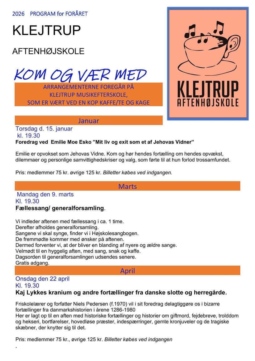 Foreningens formål er gennem almene folkeoplysende møder at bidringe viden og fællesskab. Der afholdes ca. 6 arrangementer årligt, som omhandler historie, kultur, samfundsforhold eller en aften med fællessang. Arrangementerne afholdes på Klejtrup Musikefterskole. Foreningen kan kontaktes på mail: klejtrupaftenhojskole@gmail.com eller se facebook Klejtrup Aftenhøjskole. ![]() |